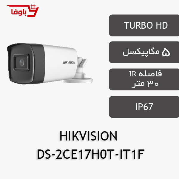 دوربین مداربسته  توربو اچ دی  هايک ويژن  5 مگاپیکسلی  مدل DS-2CE17H0T-IT1F  از سری محصولات برند هایک ویژن می باشد . این محصول دارای فناوری توربو اچ دی می باشد  . حسگر تصویری به کار برده شده در این دوربین مداربسته  5 مگاپیسل و کیفت تصویر 2560*1944 پیکسل را برای شما فراهم می کند.قدرت دید در شب دوربین مداربسته  مدل DS-2CE17H0T-IT1F  تا 30  متر می باشد .این محصول در برابر نفوذ گرد و غبار و فشارهای زیاد آب عایق می باشد و دارای استاندارد IP 67 میباشد.